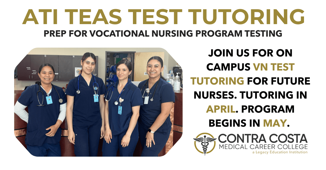 The Contra Costa Medical Career College Vocational Nursing team is hosting ATI TEAS Test Tutoring for those interested in applying for the Vocational Nursing program. The next VN class at CCMCC begins May 2026. Tutoring will take place on April 10, 17 and 24 from 9:30am to 11:30am on campus. Stop by one or all […]